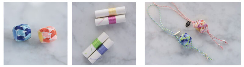 途中までできている「ゆびぬき」に糸をかがり、最後30分でくみひもと組み合わせてストラップに仕立てて完成です。
