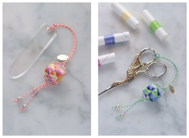トップの部分に根付け板を付ければ、彩り豊かな着物の根付けに。また、そのまま刺繍はさみやカバンの持ち手などに通して、華やかなシザーキーパーやバッグチャームにすることもできます。